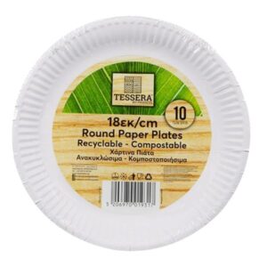 Πιάτο χάρτινο, στρογγυλό, Ø 18 cm, λευκό, βιοδιασπώμενο, κομποστοποιήσιμο και ανακυκλώσιμο. Χωρίς επίστρωση πλαστικής μεμβράνης. Ένα #plasticfree προϊόν φιλικό προς το περιβάλλον, πλήρως προσαρμοσμένο στις νομοθετικές απαιτήσεις της Ε.Ε. για την προστασία του περιβάλλοντος. Αποτελεί ιδανική λύση για την αντικατάσταση των αντίστοιχων πλαστικών πιάτων μίας χρήσης. Απαραίτητο για όλους τους επαγγελματίες της εστίασης για χρήση σε εστιατόρια, ξενοδοχεία, beach bars, ταχυφαγεία, υπηρεσίες catering, αλλά και για το σπίτι, σε εκδηλώσεις, παιδικά parties, barbeque και για κάθε οικογενειακή στιγμή και φιλική συγκέντρωση.