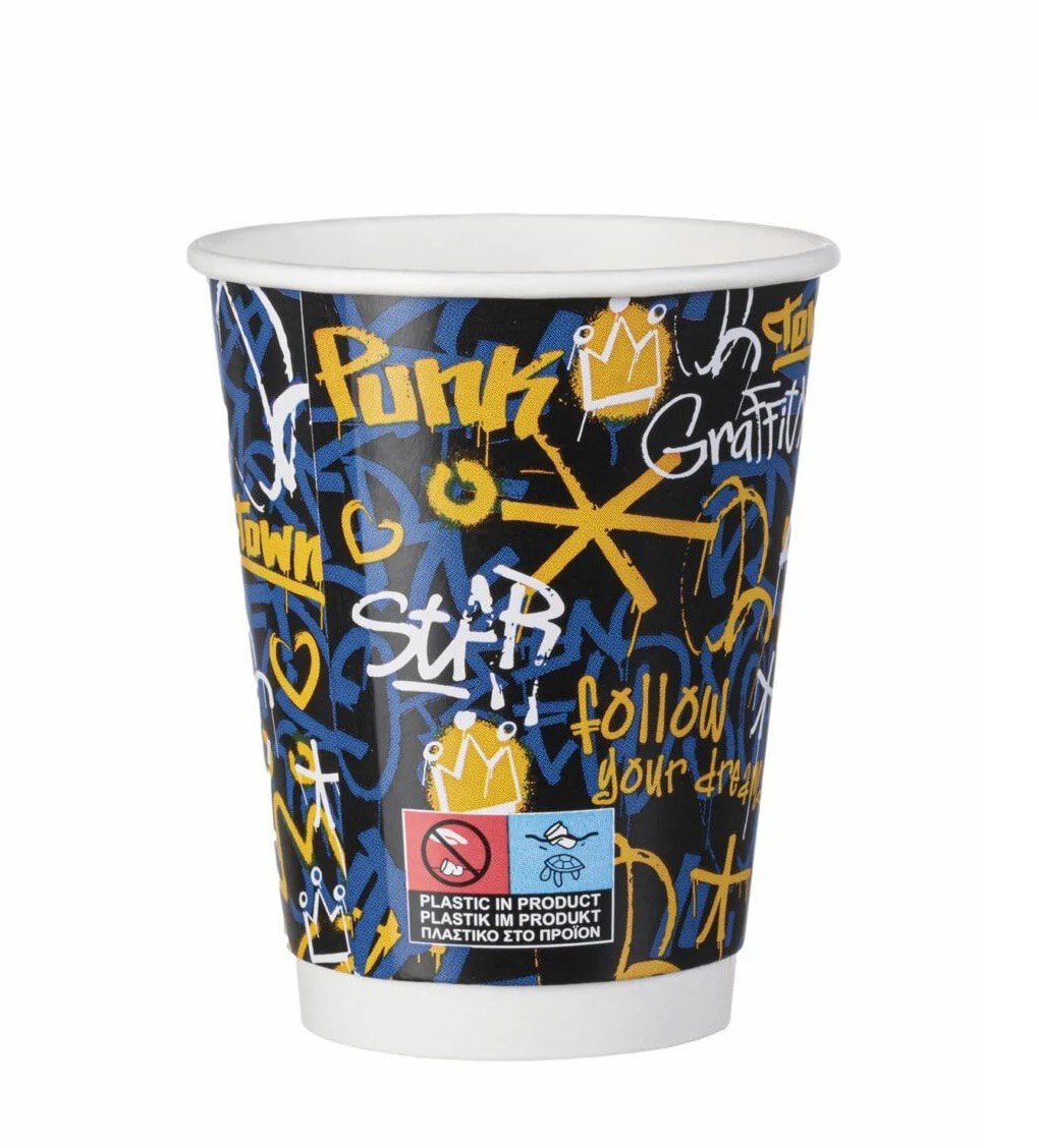 Χάρτινο ποτήρι διπλού τοιχώματος 12oz 90 mm. Με το σχέδιο Graffiti, γίνεται ιδανική πρόταση για κάθε χώρο εστίασης, που προσφέρει ζεστά ή κρύα ροφήματα.
